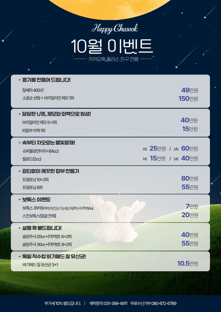 ♥은하여성의원 10월 이벤트♥ 페이지 정보 작성자 최고관리자 댓글 0건 조회 116회 작성일 25-10-01 06:31 목록 본문 ♥은하여성의원 10월 이벤트♥ 이전글10월 의료진 진료안내 25.10.01 다음글♥은하여성의원 9월 이벤트♥ 25.09.01 댓글 0 댓글목록 등록된 댓글이 없습니다.