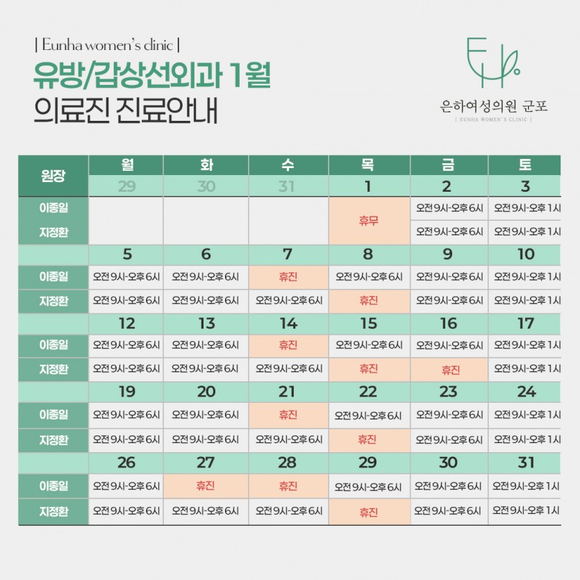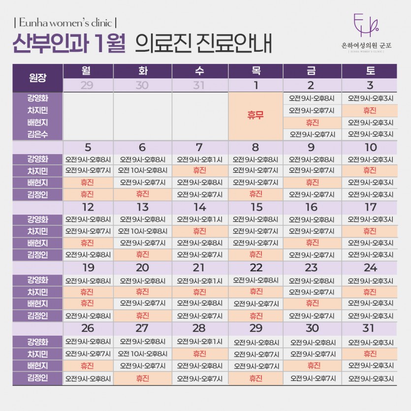 1월 의료진 진료안내 페이지 정보 작성자 최고관리자 댓글 0건 조회 4회 작성일 26-01-01 09:15 목록 본문 1월 의료진 진료안내 다음글♥은하여성의원 1월 이벤트 26.01.01 댓글 0 댓글목록 등록된 댓글이 없습니다.